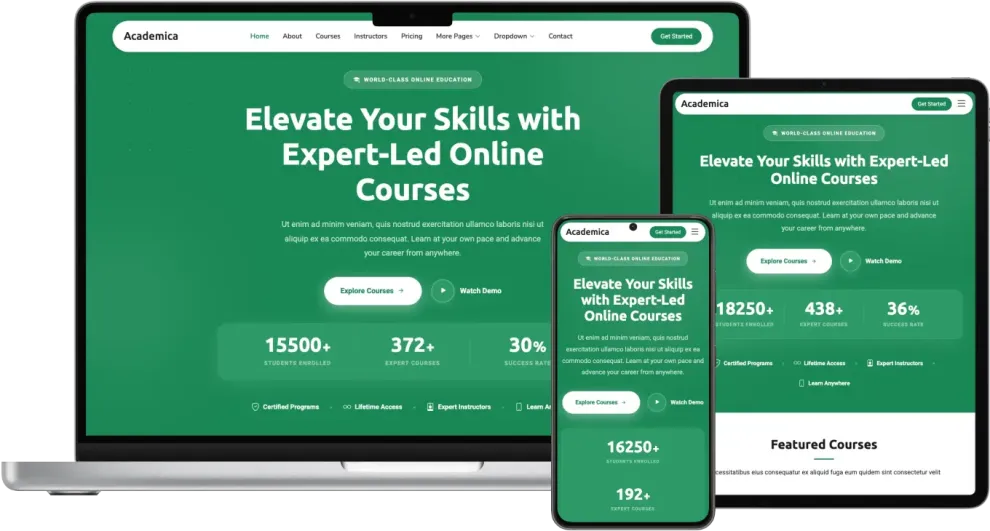 Academica is an Online Courses and Education Bootstrap template designed for schools, universities, tutors, coaching programs, and eLearning businesses that need a trustworthy web presence. It gives you a clear structure for presenting a course catalog, program highlights, instructor profiles, and pricing in a way that is easy to scan and simple to navigate. The visual style focuses on readable typography, balanced spacing, and strong calls to action, so visitors can quickly understand what you offer and how to sign up.