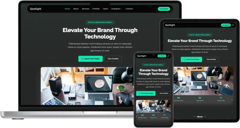 Spotlight is a modern agency template designed to help creative businesses present their work with clarity and confidence. It gives you a strong first impression with a clean hero area, focused messaging, and clear calls to action, making it a great fit for digital agencies, branding studios, marketing teams, design freelancers, and small production houses.